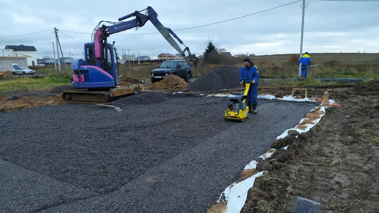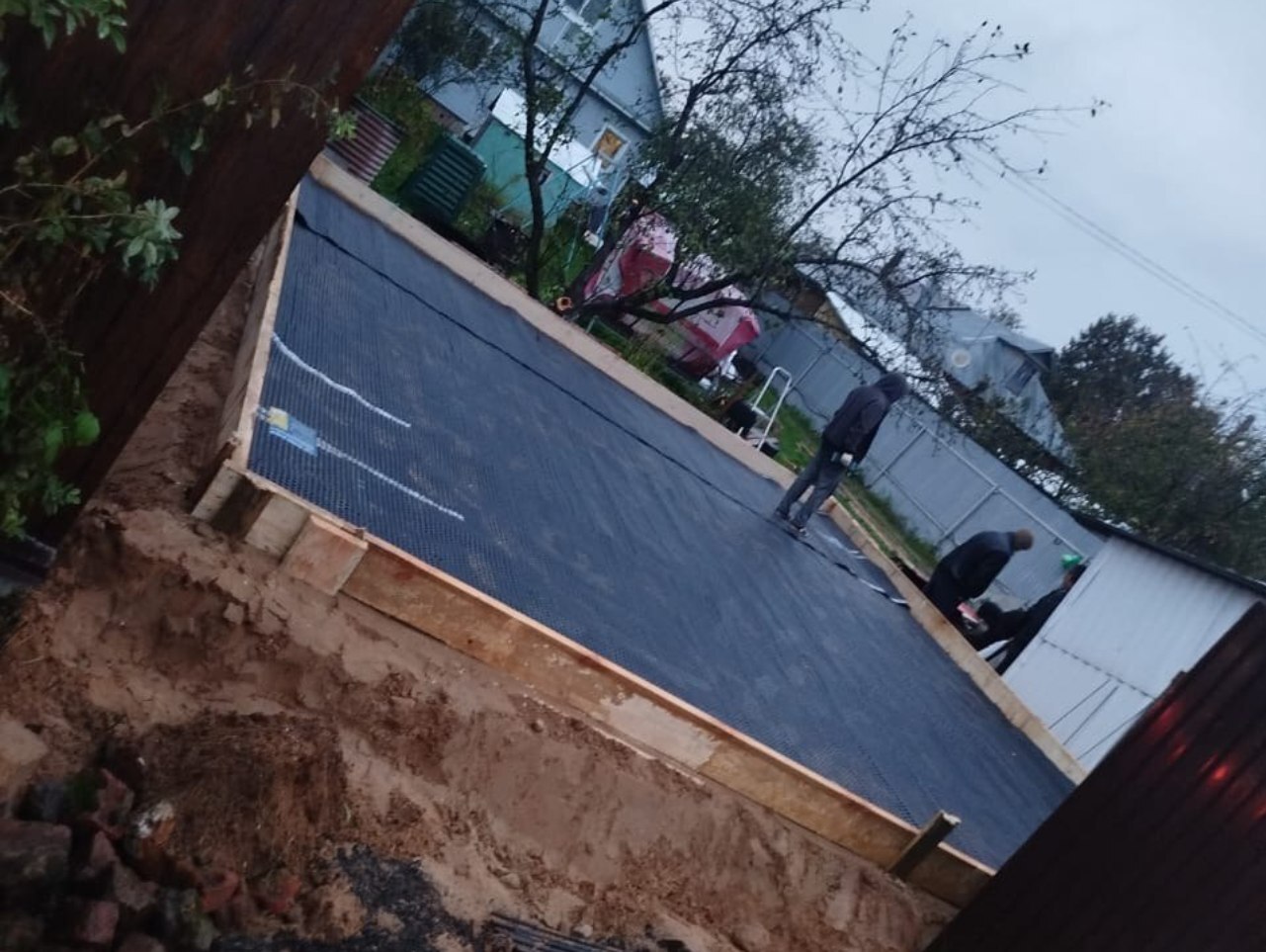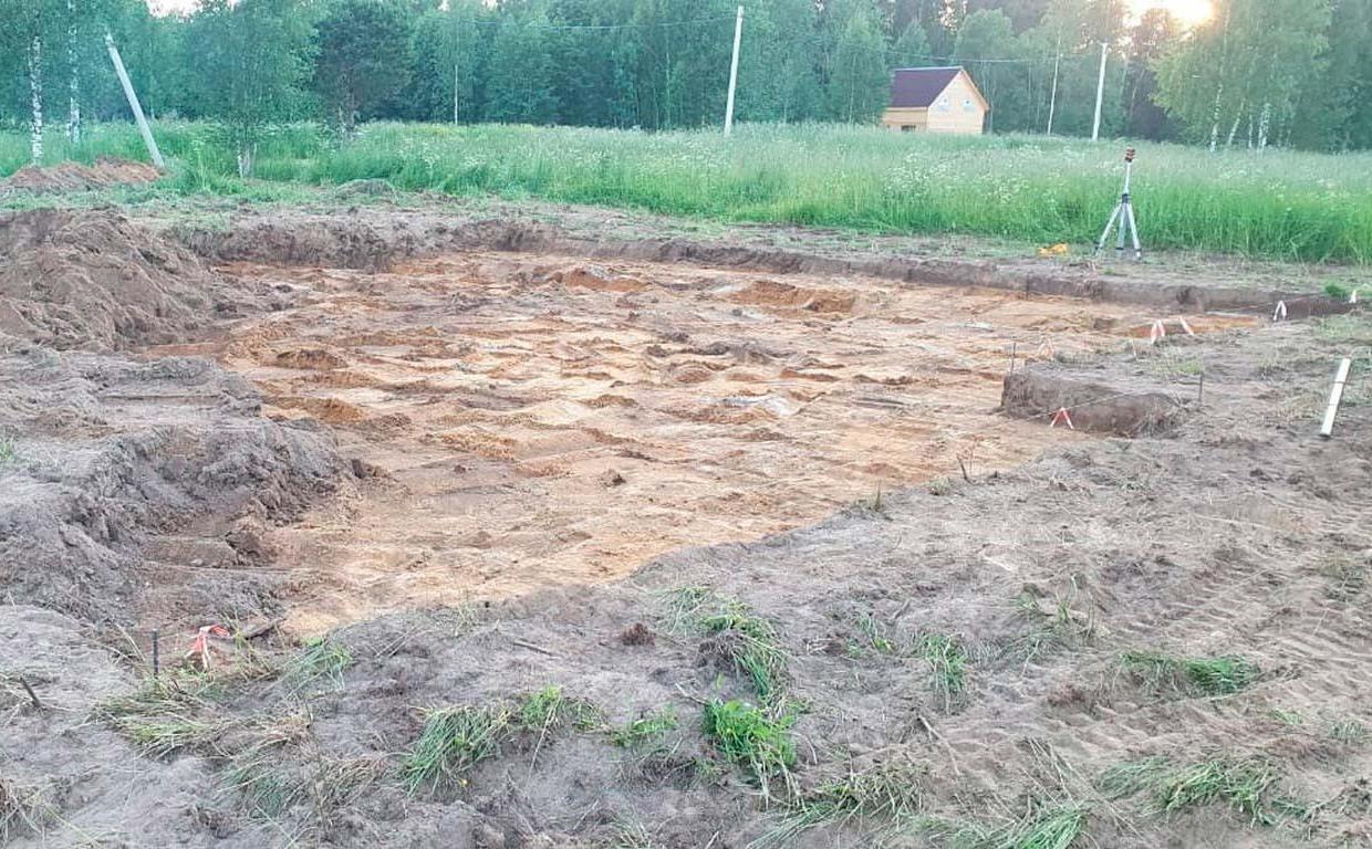 Котлован утрамбовали и выровняли под уровень, уложили гидроизоляцию.