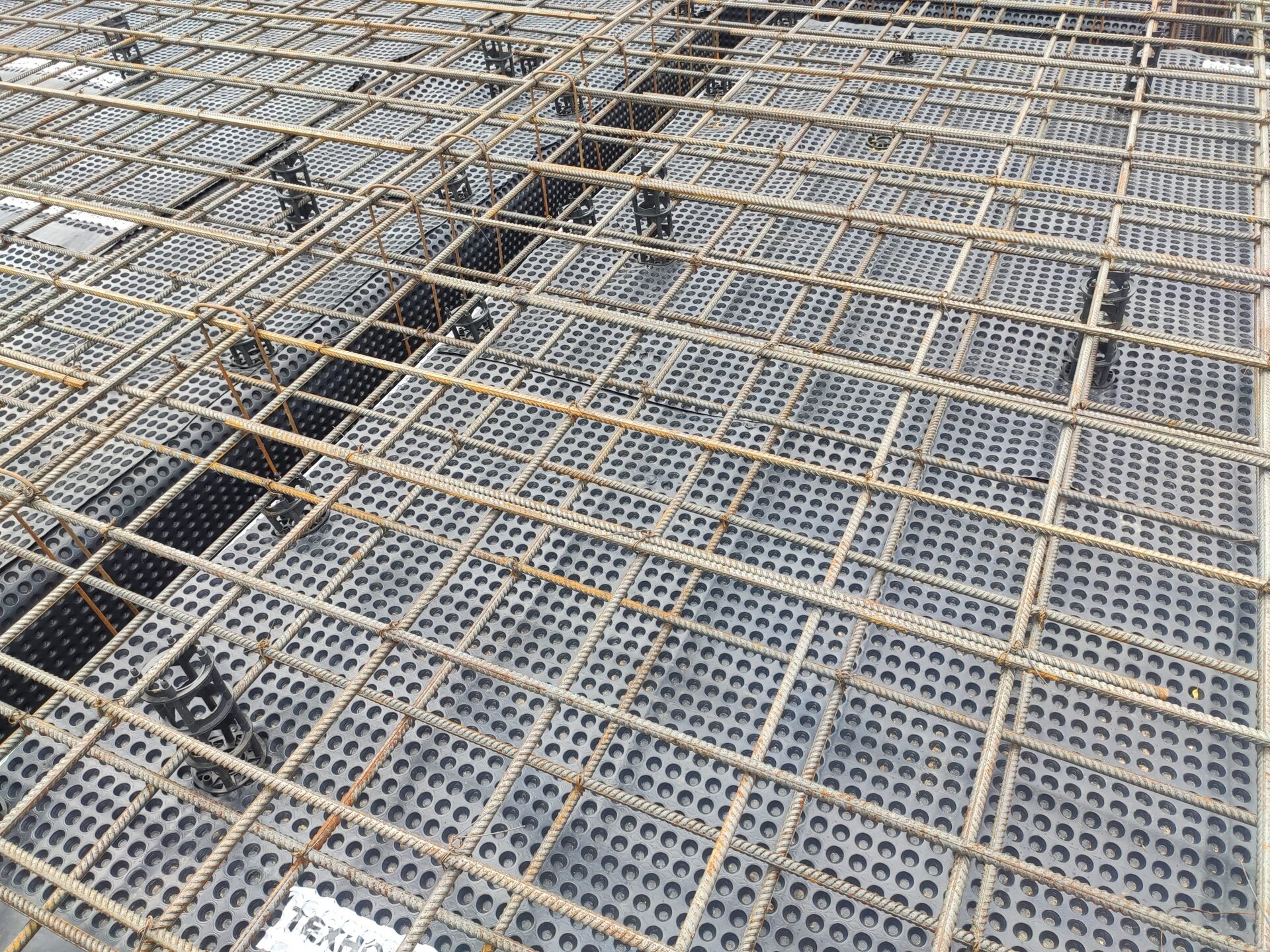 Далее установили двойную армированную сетку с ячейкой 200 мм. Залили бетон B22,5 М300 и уплотнили его с помощью глубинных вибраторов.