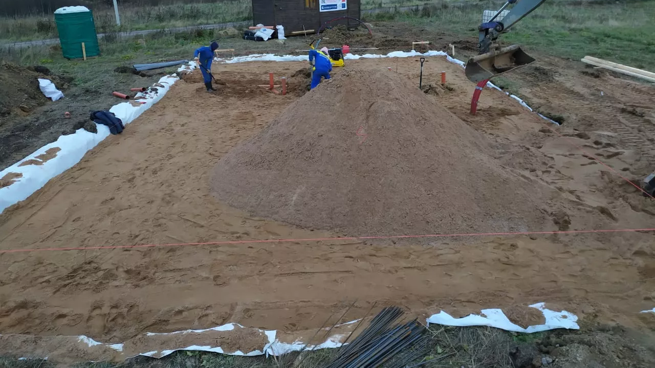 Произвели выемку грунта под фундамент, сделали обратную засыпку песком, установили армокаркас и опалубку для ростверка.