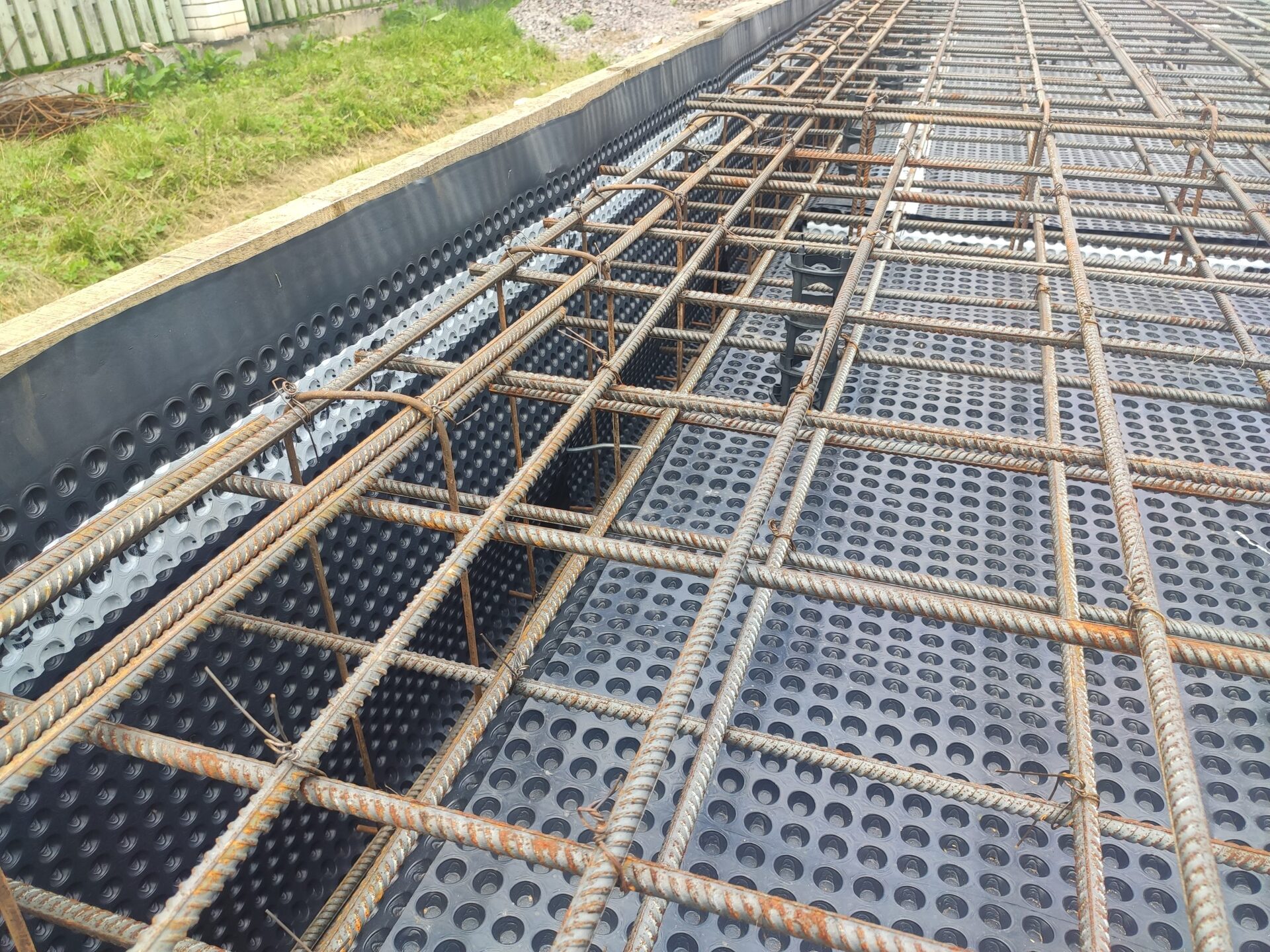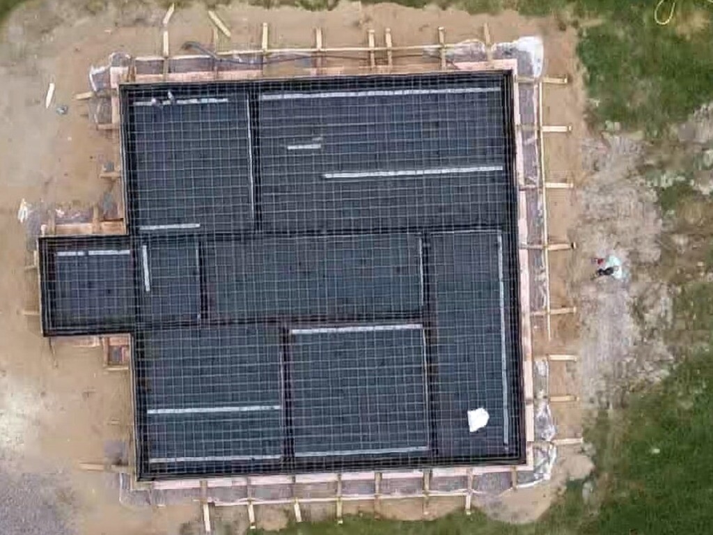 Установили двойную армированную сетку с усиленной Г-образной арматурой по периметру. Залили бетон B25 М350 и уплотнили его с помощью глубинных вибраторов.