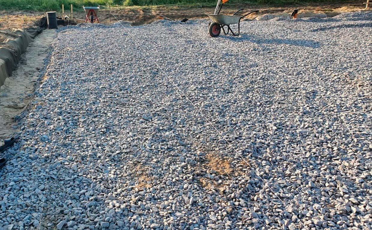 Выровняли котлован, уложили гидроизоляцию, а затем засыпку песком. На втором этапе сделали гравий и мембрану плантер.