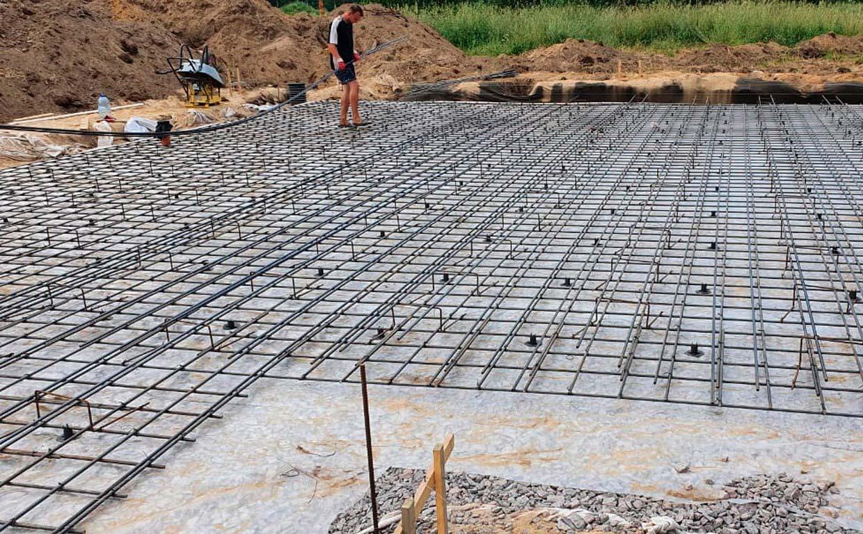 Установили двойную армированную сетку с усиленной Г-образной арматурой по периметру для самой плиты 200мм. Залили бетон B22,5 М300 и уплотнили его с помощью глубинных вибраторов.